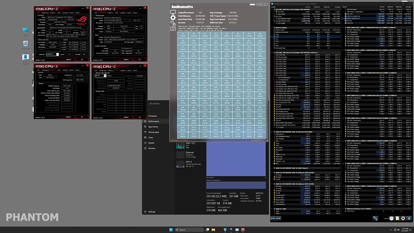 本次超频由韩国超频好手 Phantom 操刀,采用的平台是 AMD 新近推出的 64 核心处理器锐龙 Threadripper PRO 9985WX 和华硕 Pro WS WRX90E-SAGE SE 主板,内存条标定频率 7600MT/s,超频至 8400MT/s CL38-50-50。